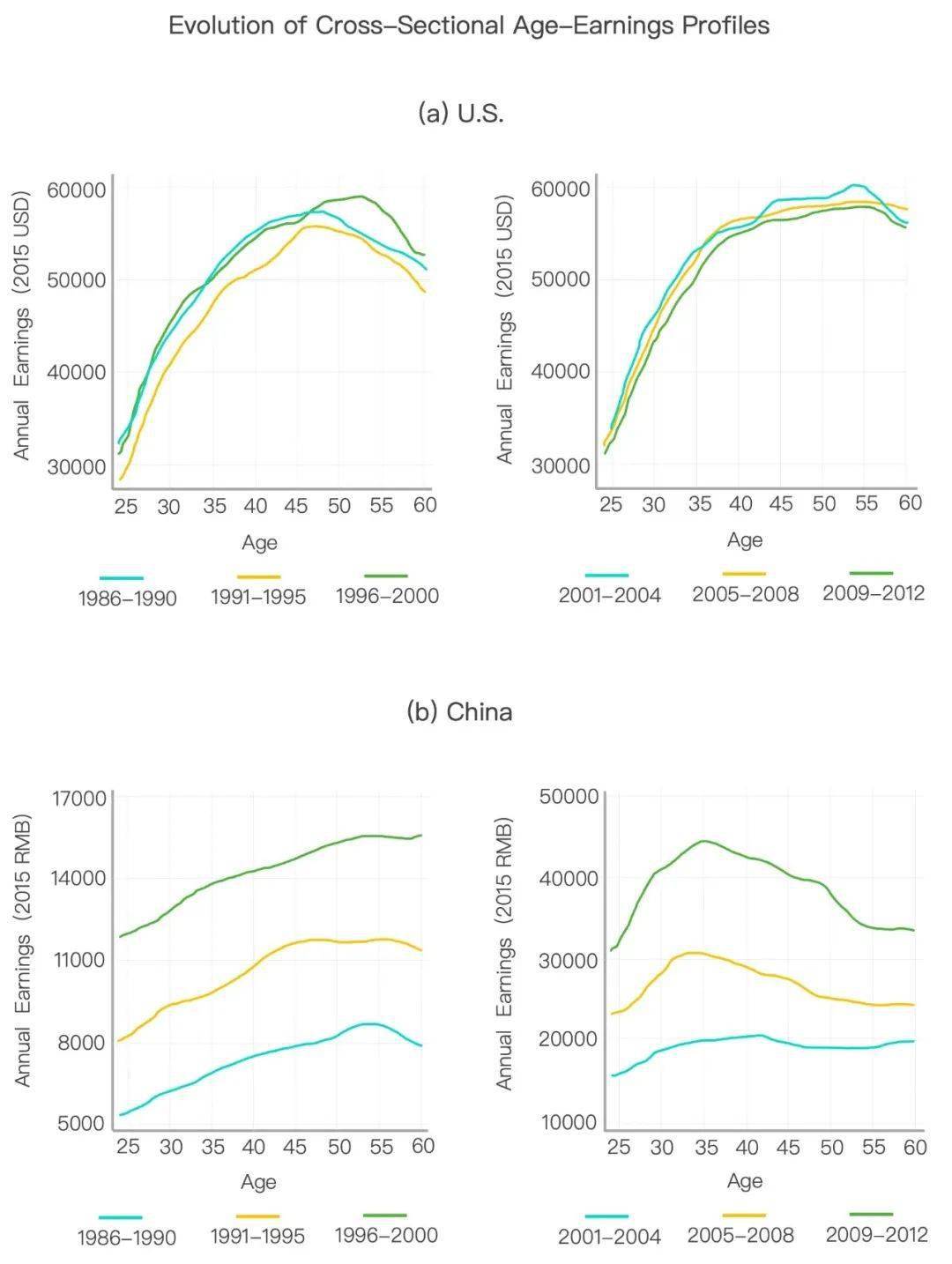 在宾夕法尼亚大学的研究中,将工资随着年龄变化的原因分解成三个部分:工作经验、时间效应(不同年份的平均工资水平变化)和队列效应(每个世代的劳动者能力差异)。他们发现美国不同年代的时间效应和队列效应很小,但在中国这两者影响巨大。这种中国经济发展、教育水平带来的工资变化效应远远超过了个人工作经验增长的价值,因此在具体时间截面上观察工资和年龄的关系,35岁左右是最高的。