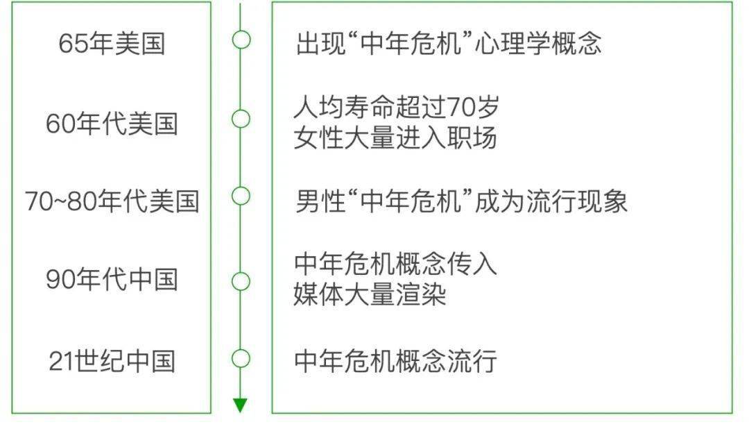中国流行“中年危机”则是从90年代开始。最早的媒体记录是1994年出现的,之后情绪共鸣开道,媒体深入报道。《帮助丈夫渡过中年危机》(中共吉林省委《党员之友》1994年12月刊),《当中年危机困扰你的丈夫时》(中日友好医院《中老年保健》1995年3月刊),《男性的中年危机》(广西医学情报研究所《医学文选》1998年5月刊),《中年危机静悄悄地来》(经济日报社《中国企业家》2000年9月刊),让这一概念传遍大江南北。