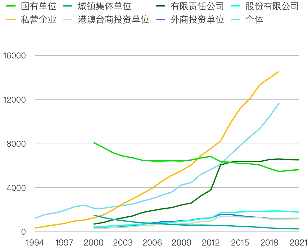 1994年到1996年,国有工业企业利润占比从50.5%降至29.3%。非国有经济(集体、个体、私营和外资经济等)快速成长,逐渐成为国民经济的主体,在全部工业企业总产值中占比为71.5%。城镇工作人员在各类型工作单位的占比在94年之后的变化如下: