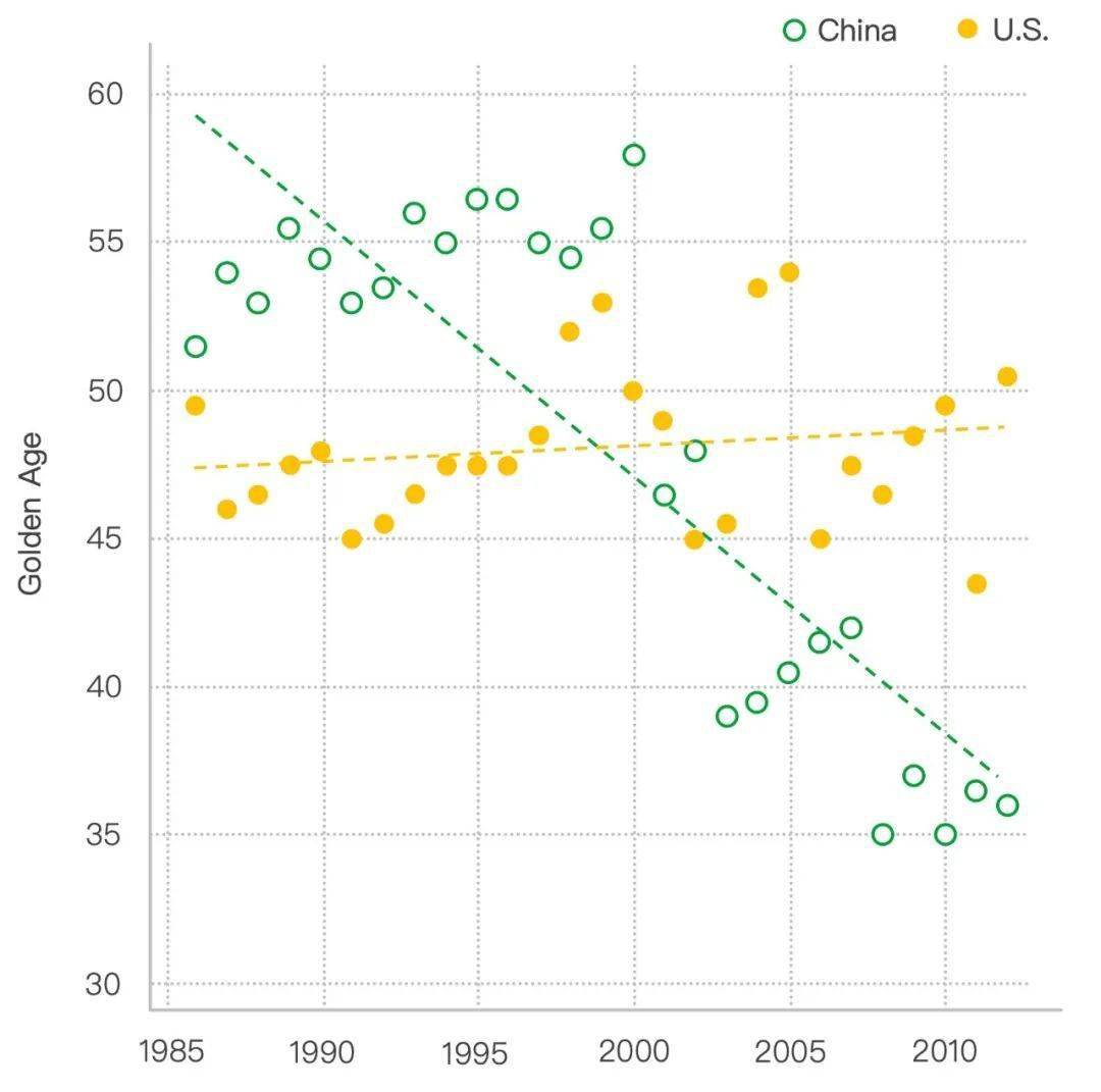 美国达特茅斯学院与英国华威大学两位教授研究发现,55个国家的人在46岁时心态陷入最低谷,中国则提前了10年。宾夕法尼亚大学的论文研究显示,就业市场上的年龄收入曲线呈现倒U型分布,倒U型顶部的年龄称为“黄金年龄”。美国和中国的2000年以前,“黄金年龄”稳定在50-55岁左右。2000年以后美国继续不变,但中国的黄金年龄不断下降,到2005年以后降至35岁。