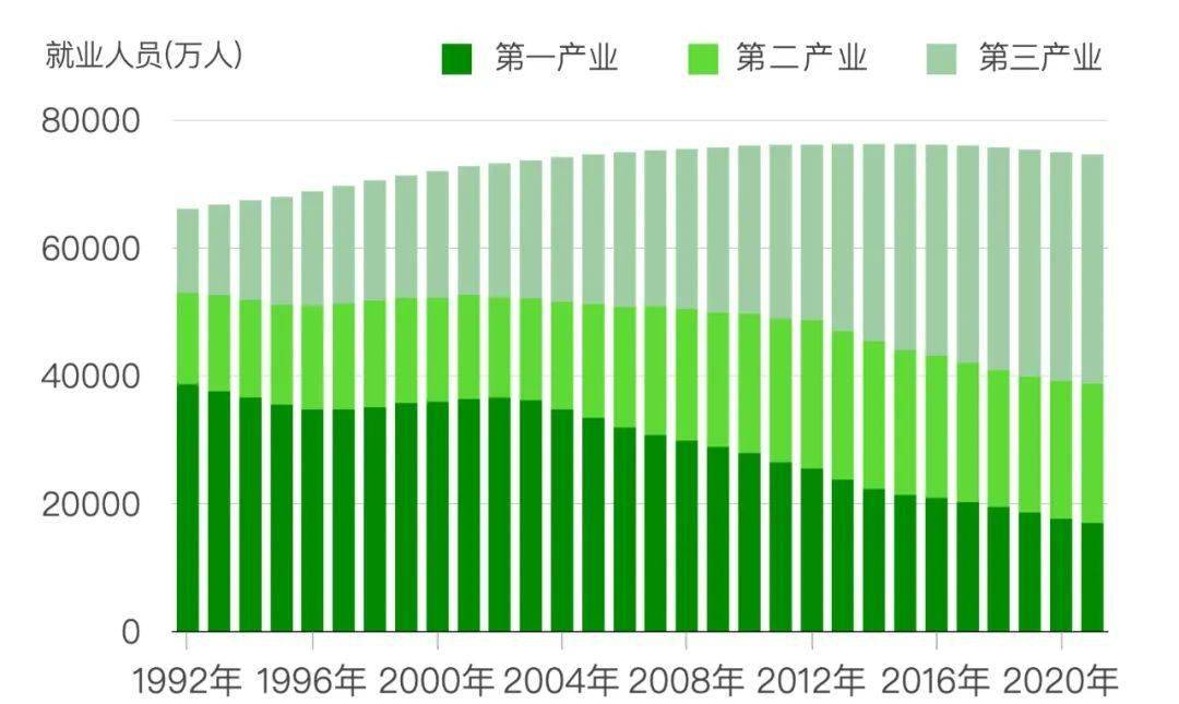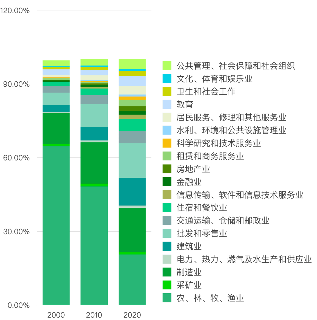 根据最近三次每十年一度的人口普查数据可以看到,各行业的从业人员占比发生了明显变化。