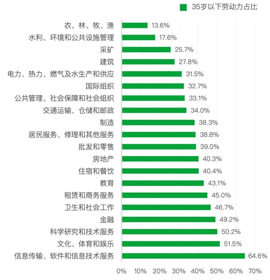 第七次人口普查数据显示,信息传输、软件和信息技术服务业,文化、体育和娱乐业,科学研究和技术服务业,金融业这四大类行业的35岁以下就业人口占比位居前四,而这些恰恰是产业结构变迁中越来越重要的主力产业。