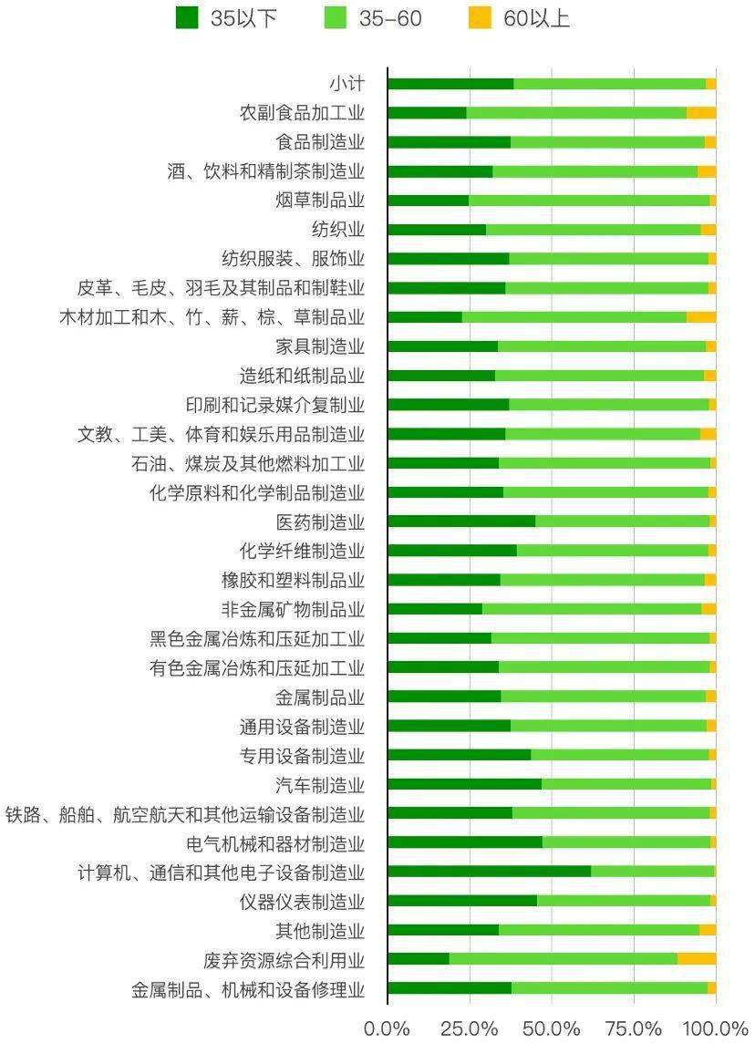 即便是就业人口最多的所谓“传统行业”——制造业,其中的细分行业如计算机、通信和其他电子设备制造业,电气机械和器材制造业,汽车制造,医药制造业等正在不断发展的先进制造业就业人口中,35岁以下占比也是相对更高的。