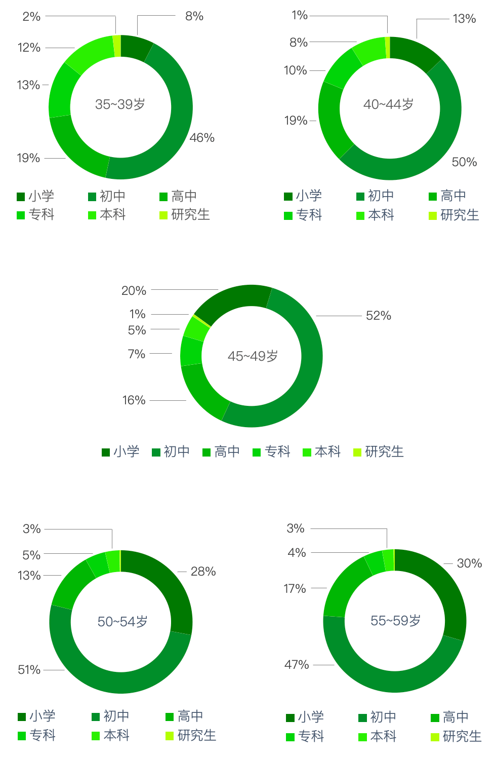从受教育程度来看,中年相对年轻的年龄层明显本科和专科率要数倍于更年长的群体。