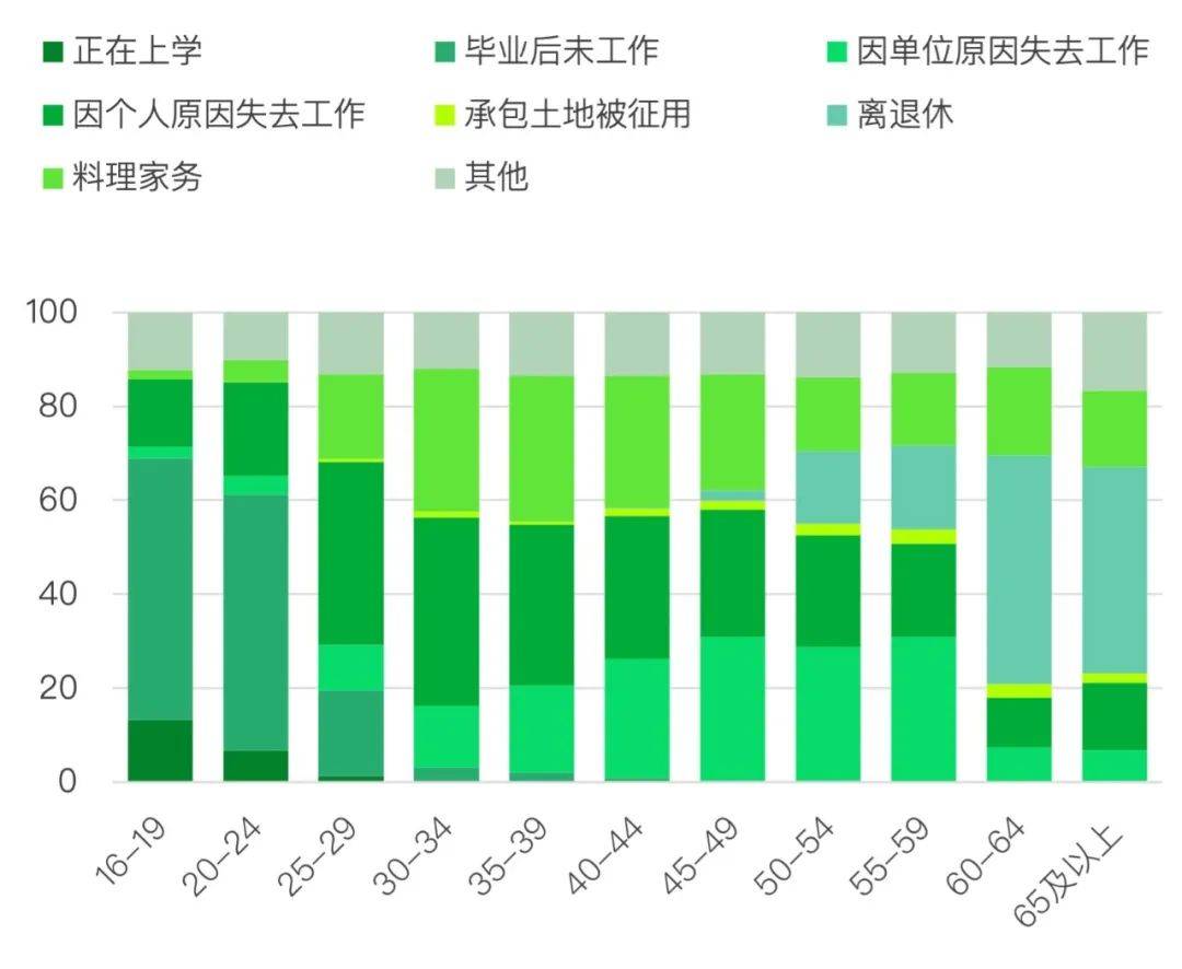 未工作的人,失业原因分布如下。中年人在职的,因单位原因失去工作的最为显著。