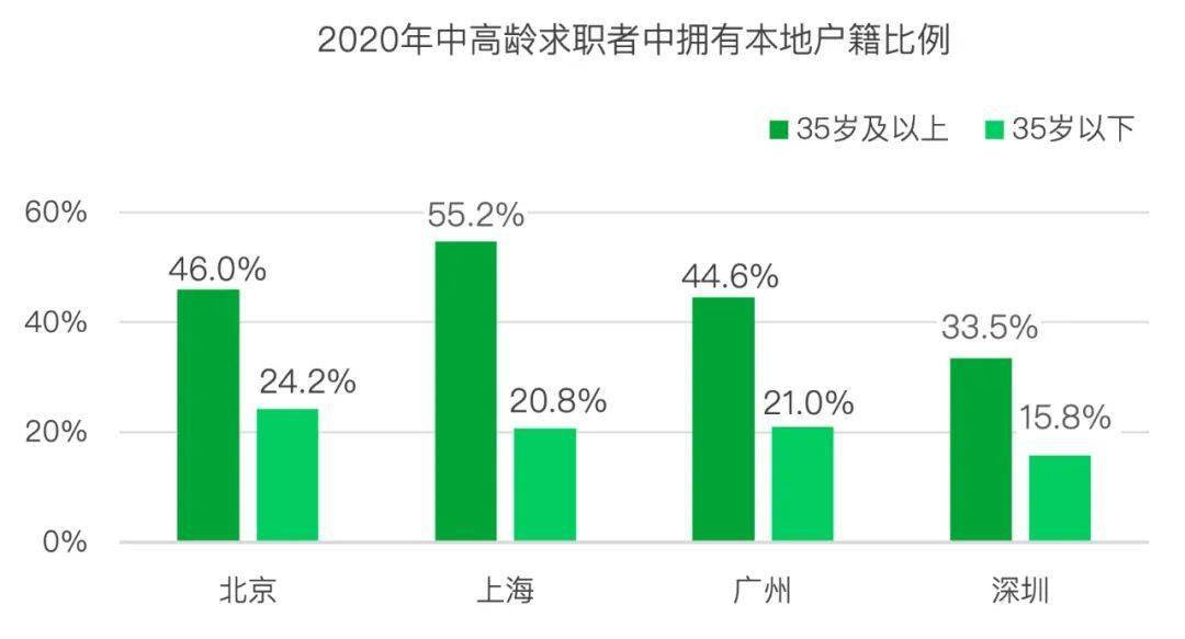 45.4%一线城市中年求职者拥有本地户籍,流动性低。即便其他城市的人才需求缺口更大,中年求职者携家带口流动到其他城市就业的意愿较低,这也是他们再就业压力较大的一个重要因素。