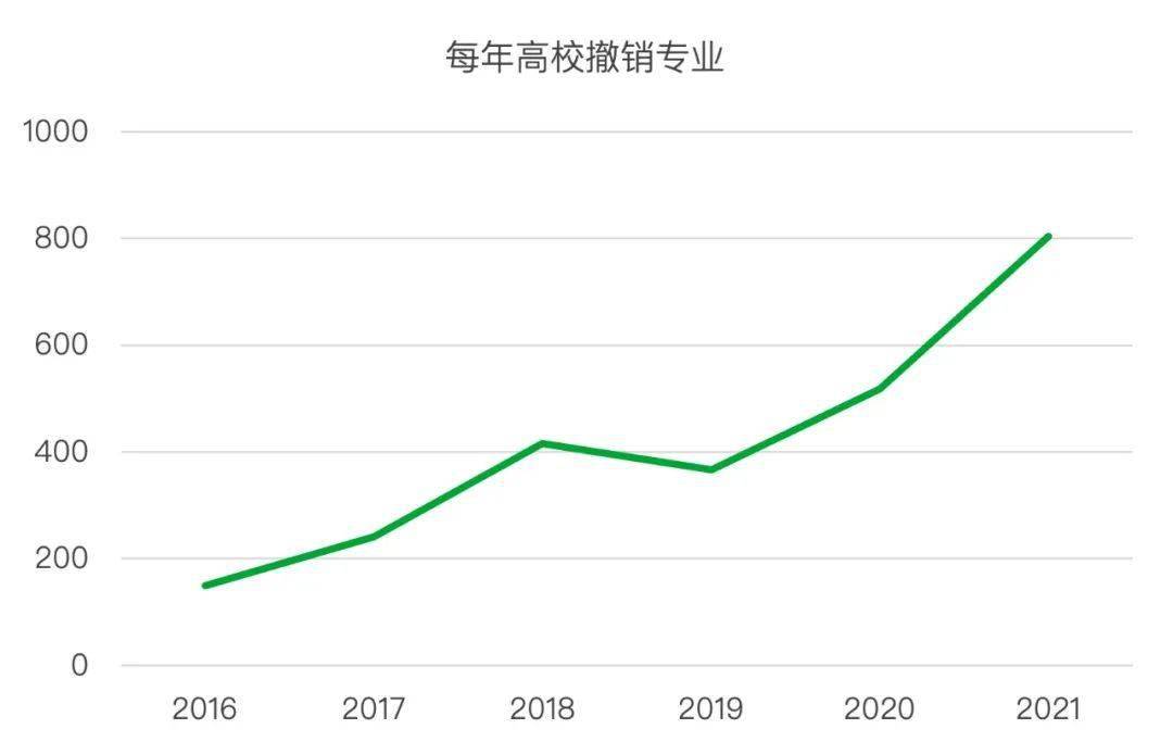 产业结构在轮替更迭,但源源不断涌入的年轻人的判断是滞后的,供远大于求。2021年,高校专业撤销了804个,涉及的大学从985到民办三本都有。这个数据在2014年以前基本在100个以下,之后便一路攀升。它们都是曾经的热门专业,甚至有些现在仍是热门。