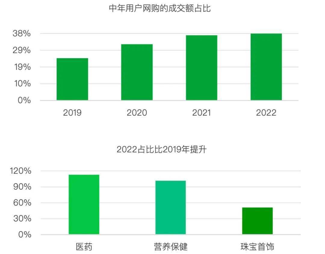 中年群体在电商消费的习惯正在快速养成,并且占全部用户成交额的比例越来越大。有趣的是,中年人群占总人口数量的38%,而在2022年,他们网购的成交额占比也达到了38%。基于中年人群网购习惯总体尚没有年轻人高,他们在线下消费的占比会更高一些,这样的交叉比对可以佐证中年人实际的消费能力相比其他年龄段更强的事实。