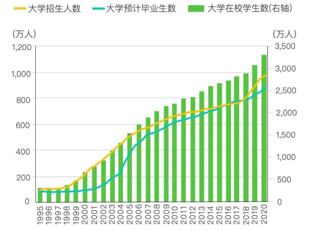 产业结构的变迁注定了对年轻人的偏好。而加剧35岁以上劳动力被市场出清的,是年轻劳动力整体进化太快、优秀的年轻人供过于求的事实。自我国1998年大学扩招以来,大学毕业生人数呈现了快速增长的趋势,新世代劳动者的平均学历迅速超过前一个世代。2021全国高校毕业生高达909万,预计2022年将高达1076万。