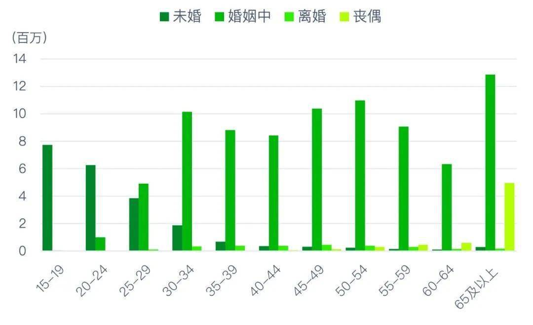 中年群体的婚配情况显示,相比于年轻人以及老年人,未婚、离婚、丧偶等情况都占极少数,九成以上的人群处于稳定的婚姻之中。