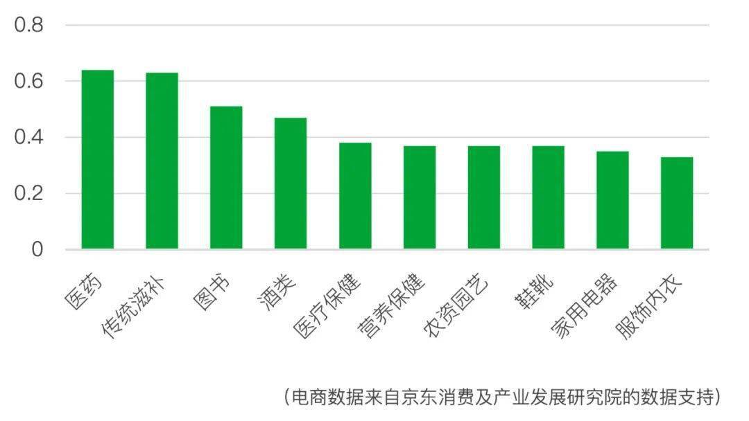 如果我们关注中年人群独特的偏好,可以通过他们对各个品类的偏好系数来发现(该群体该品类成交额占比/全部用户该品类成交额占比-1)。大于0则表示相对于其他年龄层,中年人更偏好此品类,且数字越大越偏好。在排名前十的一级类目中可以看出中年人明显的消费重心:保重身体,喝好玩好。一边读书,一边DIY。