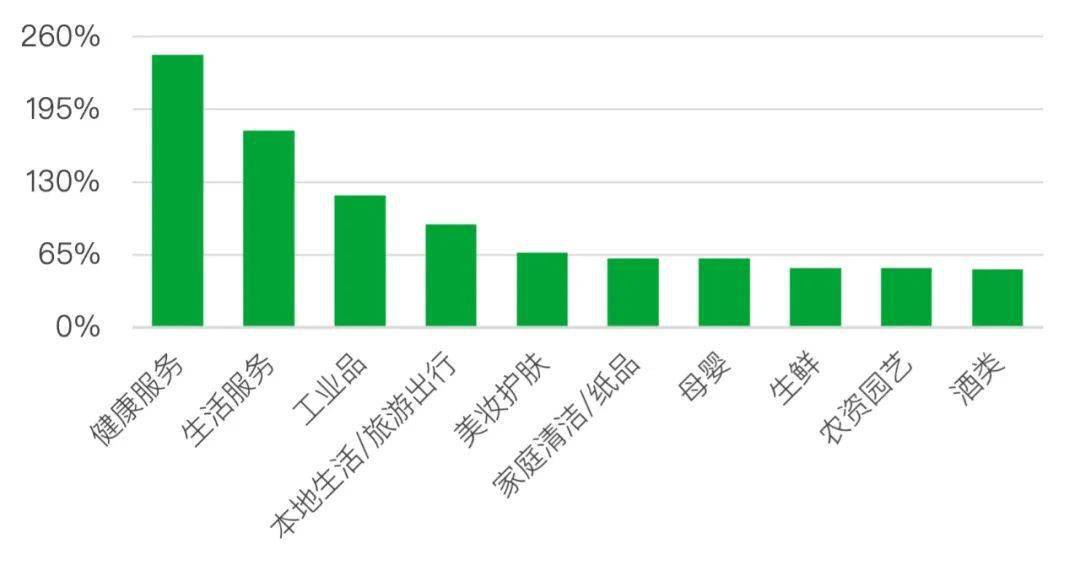 有10个一级类目近3年成交额年均增长超过50%。可以看到,健康、家庭相关的消费需求增长强烈,并且还有工业品、农资园艺这样的强烈DIY属性的“小众品类”上榜。