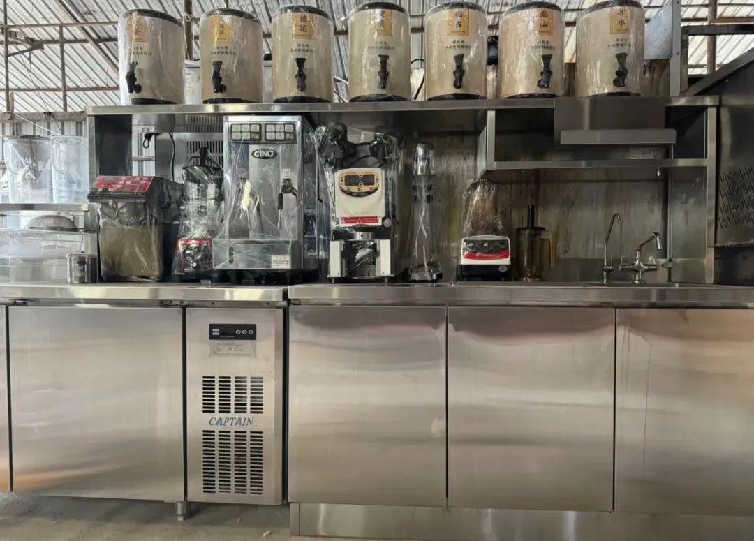 许多停业的奶茶店其实没开多久,走进去看,一排排茶桶还整齐地排列在操作台上,冷冻柜、沙拉柜的铁皮锃亮;店内奶泡机、蒸汽机和保温桶样样不缺,门后堆放着成箱的塑料杯和吸管,随时还能端出去招待客人。有的店铺门口,甚至还摆放着开业时留下的鲜花。